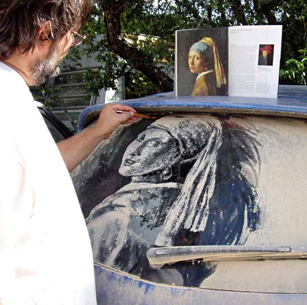 يرسم هذا الفنان الموهوب مشاهد مشهورة وأشخاصا ورسوما بغبار نافذة السيارة. من الصعب أن يثق أن هذه الرسوم يصنع بالغبار