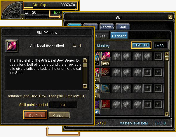يتم عرض مستوى المهارة التي يتم تعلمها وتظهر كلمة UP (زيادة) في حالة إمكانية زيادة المستوى